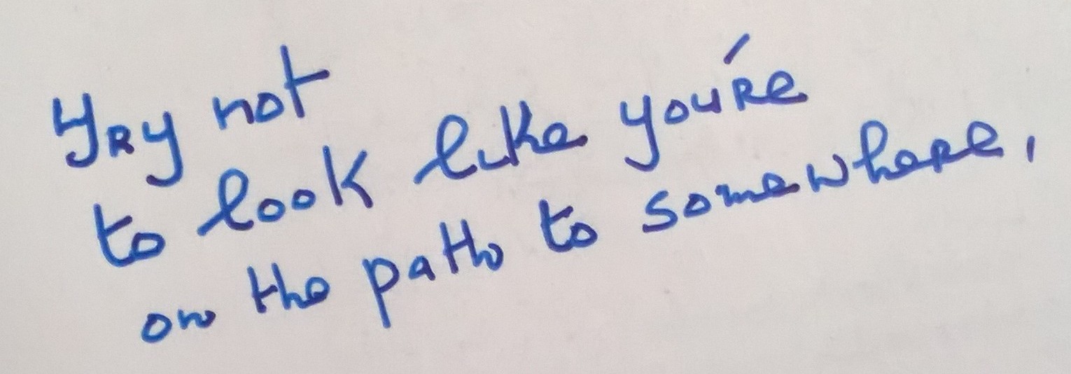 It was written unhurriedly then handed back to me as I was about to knot my handkerchief to follow the double yellow line brick road. Naturally, I heeded this essential advice and made sure not to walk with any obvious intent, especially towards cakes or airport check-ins. I kept all movements casual. Why? Well, because I was already doing so for years anyway. Plus, as further reasoning beyond the comma reveals: